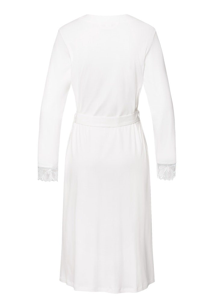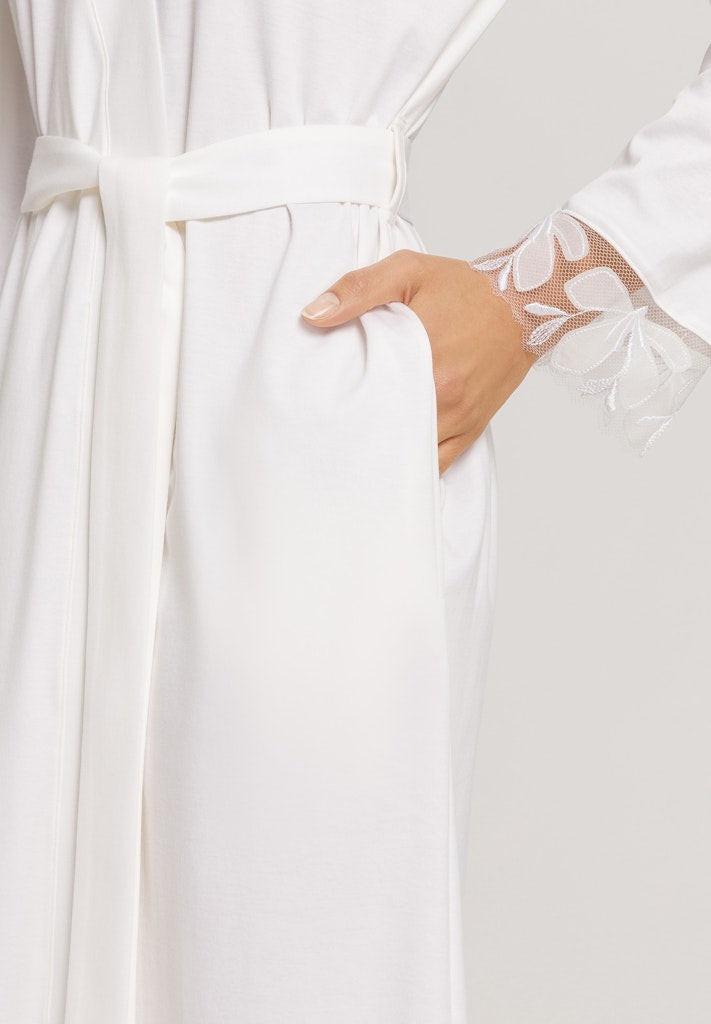 Indulge in luxury with the Kalea NW Robe. Made for cotton lovers, this classic yet feminine nightwear is crafted from soft, flowing mercerized interlock cotton. Exclusive to HANRO, delicate floral embroidery on a tulle base from Austria adds a touch of elegance to this 115cm robe.