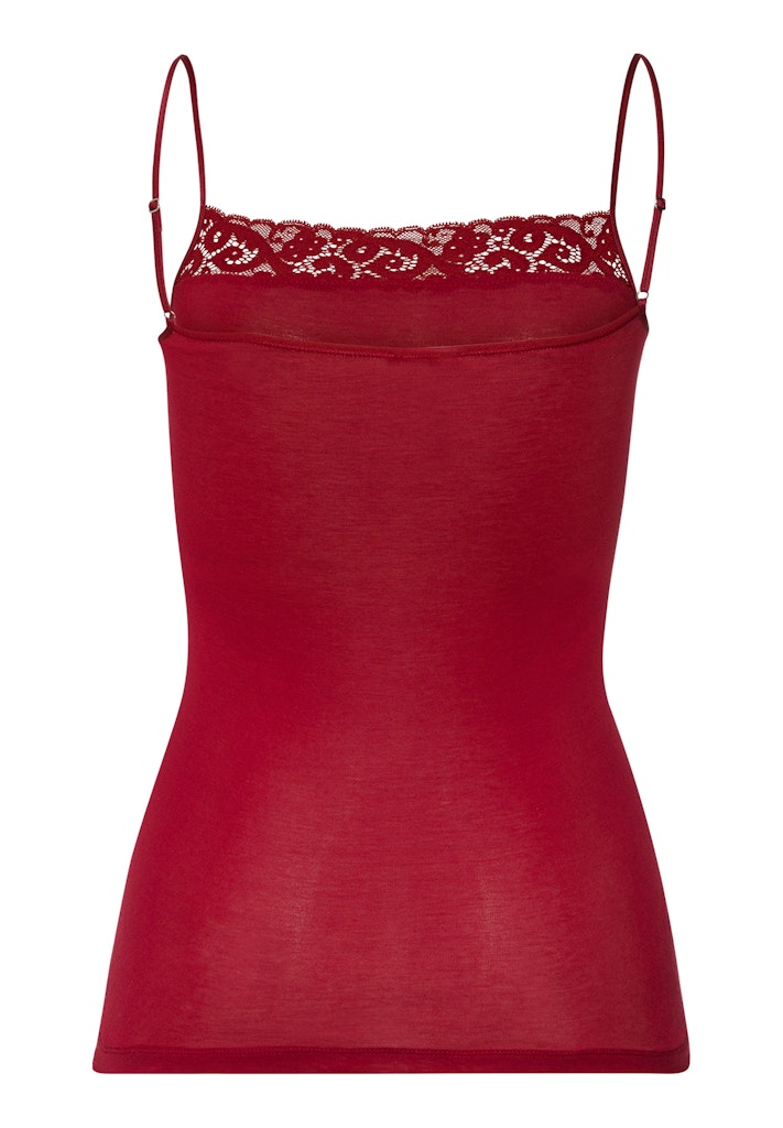 This elegant spaghetti top from our Moments collection conjures up a feminine, sophisticated look. The style impresses with a body-hugging silhouette, silky-soft cotton quality, French lace decoration on the straight neckline and side seam-free workmanship. A perfect style for blazers & co.